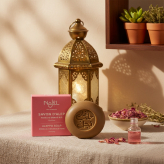 Deze zeep combineert de eeuwenoude Syrische knowhow op het gebied van het maken van Aleppozeep met de deugden van biologisch Damascusrozenwater, verkregen door stoomdestillatie van Damascusrozenblaadjes.