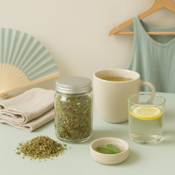 Deze kruidenthee bevat salie, wat het zweten van voeten en handen, al dan niet veroorzaakt door koorts of de menopauze, vertraagt. Het werkt ook tegen overmatig zweten 's nachts en bevordert zo de nachtrust. Klaver en Vrouwenmantel verhelpen de hormonale en stressgerelateerde aspecten van overmatig zweten. Een goede algemene eliminatie wordt opnieuw gestart met heide, paardenstaart en salie. Dit alles vergezeld door het zeer verfrissende effect van pepermunt.